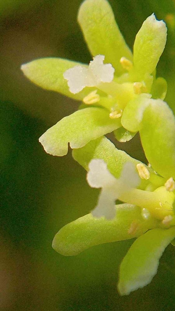 かわいい緑の花 白い雌しべがクローバー♣のように突き出ています そして花びら近くには雄しべも見て取れますがコレはどうしたものかわかりません?🤔