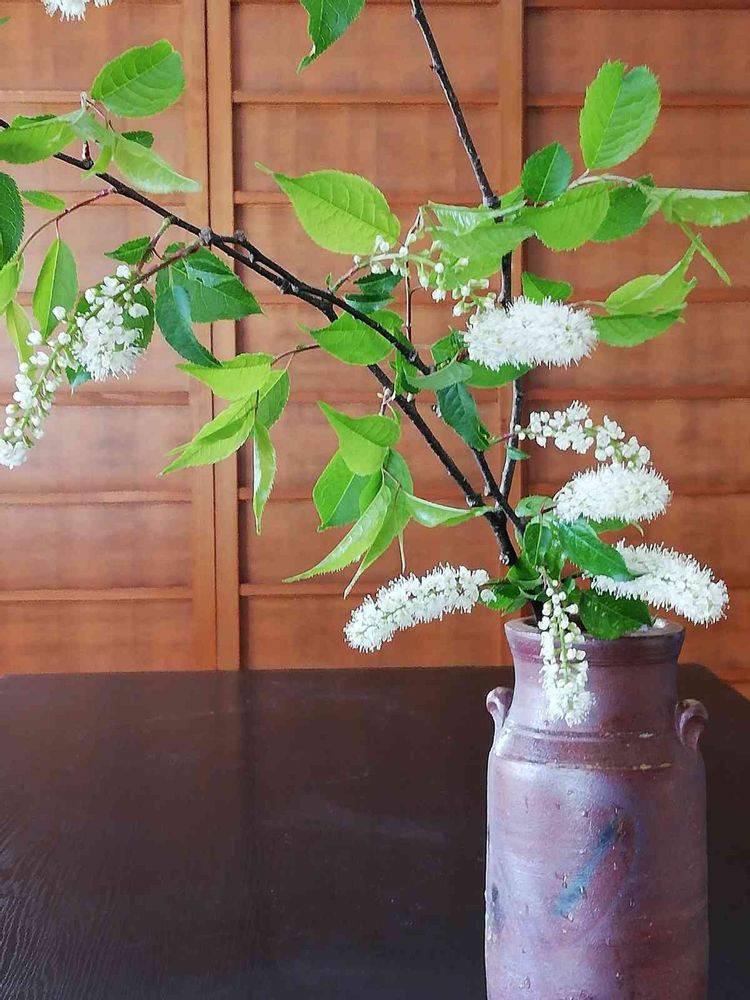 ウワミズザクラ(上溝桜)を備前焼の花瓶に生けて♡
