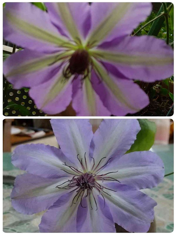 おはようございます🎵先日の強風で、ベランダのクレマチスの鉢が床に堕ちてしまい、陶器の鉢だったので割れてしまいました💦本体は無事でしたが、先端部と花が1本折れたので1輪指しに活けました😁上折れる前の花、下折れて部屋に入れた時の花。同じ花なのにどうしてこんなに色が違うのでしょうか?ちなみにお迎えした時は下のような色でした😅