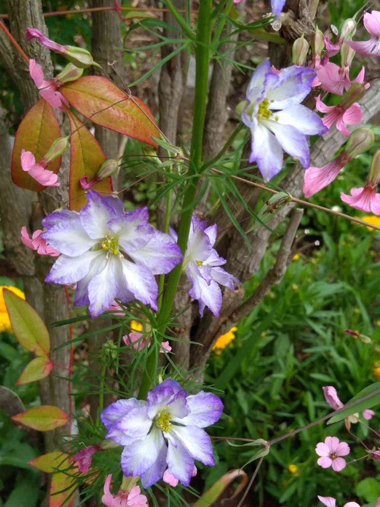 南天の根元からひょっこりと出てきたラークスパーは、きれいな色でした💜