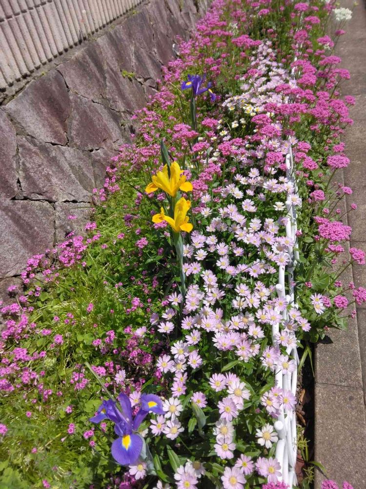 私が植えている、遊歩道に黄色、紫色のアイリスが咲いたよ🤗、もっと沢山植えれば良かったのに!!