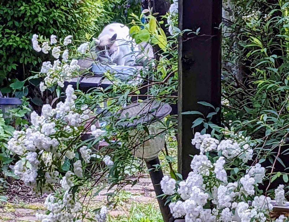 この所の強雨強風で八重咲き小手鞠の姿もすっかり乱れて…花後にはもう少しコンパクトにしてあげた方がいいかもしれません