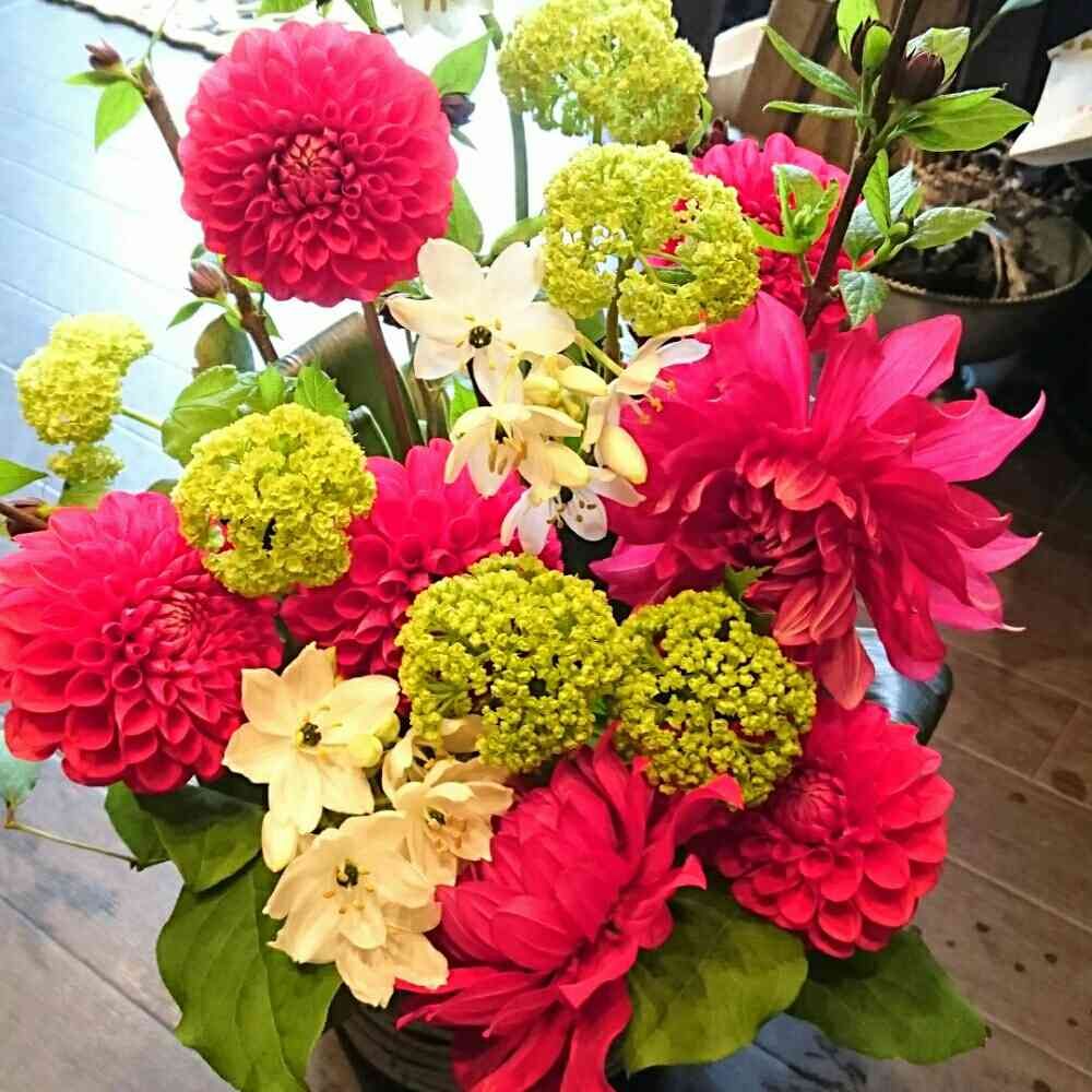 豪華なアレンジメントですね✨✨ダリアの色がイイですね💕