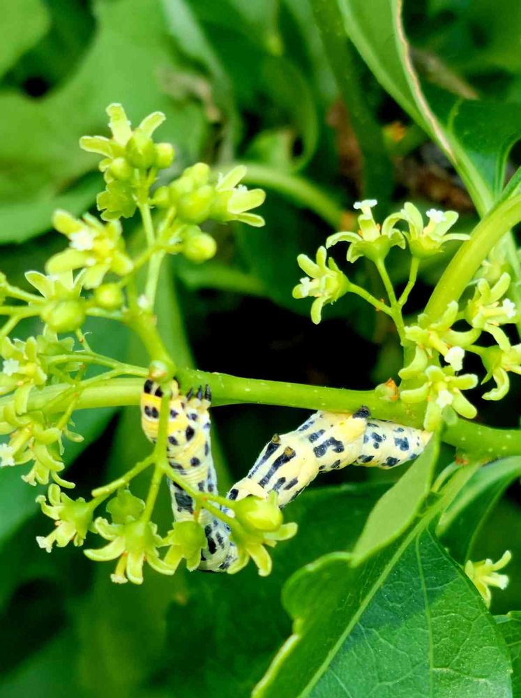 ツルウメモドキの花に、キアゲハ幼虫だと思いますが、食事中のようです、。