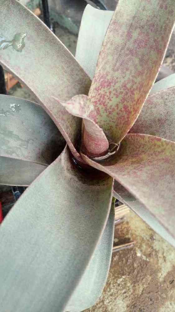 ネオレゲリア属:硬い葉系のタンクブロメリアで花茎を伸ばさずタンクの中心に花が咲きます。