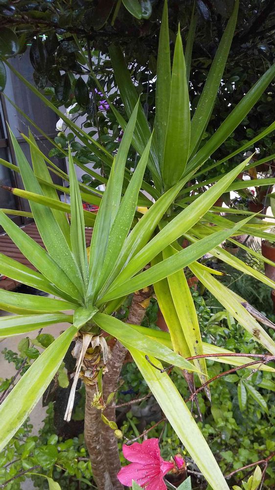 5月2日の ユッカという植物でした。雨の中の花は ミニ薔薇です