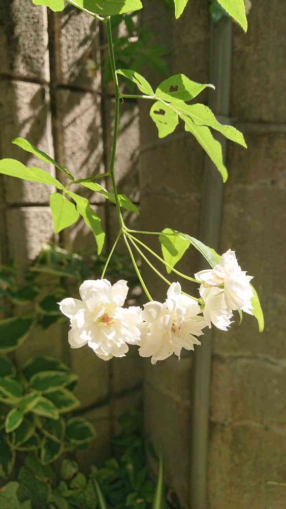 このモッコウバラの葉っぱ、ひと枝だけ離れて垂れていて、めちゃくちゃ目につくんだよ