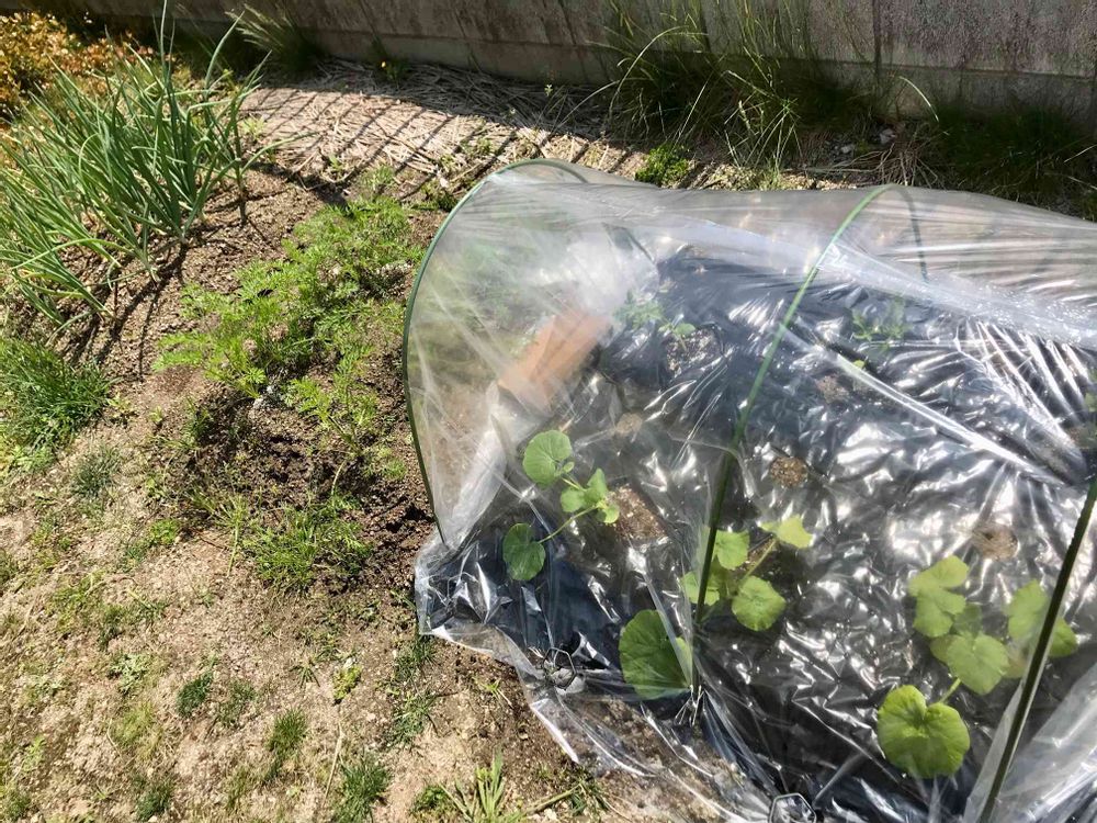 この前植え付けたスイカとカボチャも寒かったでしょうね、急いでビニールをかけてやりました。