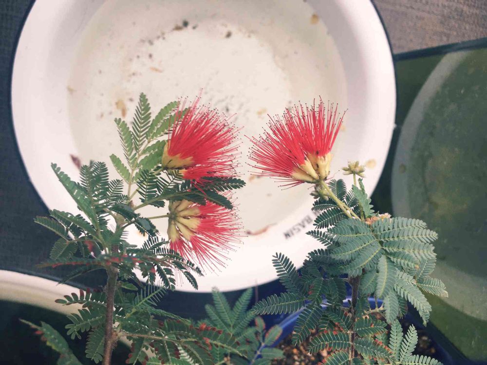 ネムの木。夜になると葉っぱが閉じます。エバーフレッシュと同じような感じ?夜と昼、違う顔があります。本当、色んな植物がいておもしろいです😊ヒネムは花がかわいい✨