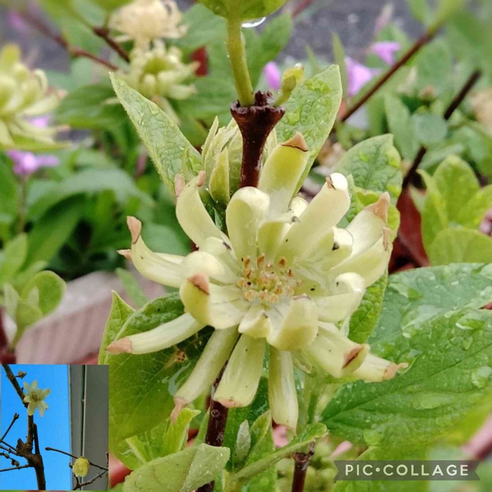 夏に咲く蝋梅😳!! 左下隅に小さく入れた写真は、昔我家に母が持ってきて植えた素心蝋梅が1月に咲いた様子。春夏は枝が伸びて茂りまくり、剪定が大変で、「何でこんな地味〜で剪定が大変な木を、母はくれたんだろーか?」と若い頃は思ってましたが、そのうちに花が少ない厳冬期に咲き高貴な香りを放つこの花の良さが分かるようになりました✨・・・そして、花木屋さんで、やはり地味で素朴な花に惹かれてしまうとは・・・母の気持ちが理解できる歳になったのでしょう。私も自分の子どもが、もし庭を持ったら、自分が植えたいけど庭が狭くて植えられなかった木を植えて貰うことでしょう・・・🌼