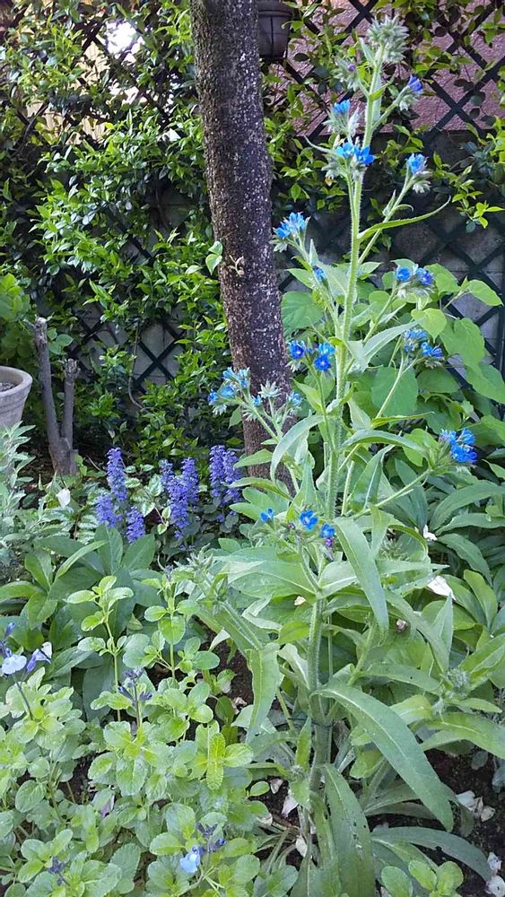 ハナミズキの下の宿根草エリアで咲いてます。アンチューサ、アジュガ、チェリーセージのブルー🎵