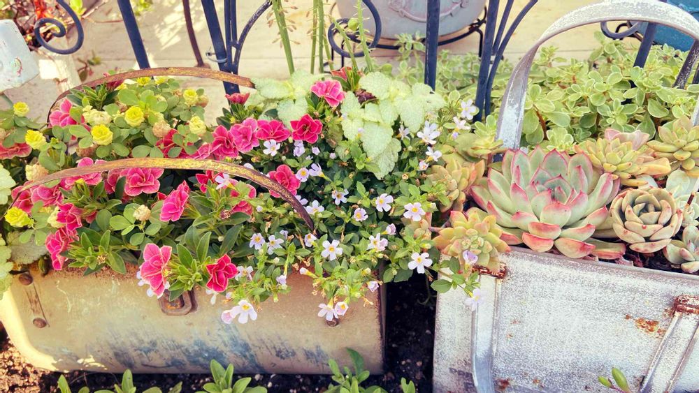 ブリキに寄せ植え😊