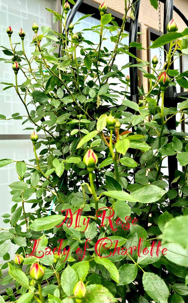 うちのシャーロットは2年目です。ちょっと日当たりの悪いところに植えてるので、あまり大きくなってませんが、花は大輪です。今は支柱ですけど、どう仕立てようかまだ悩んでます。