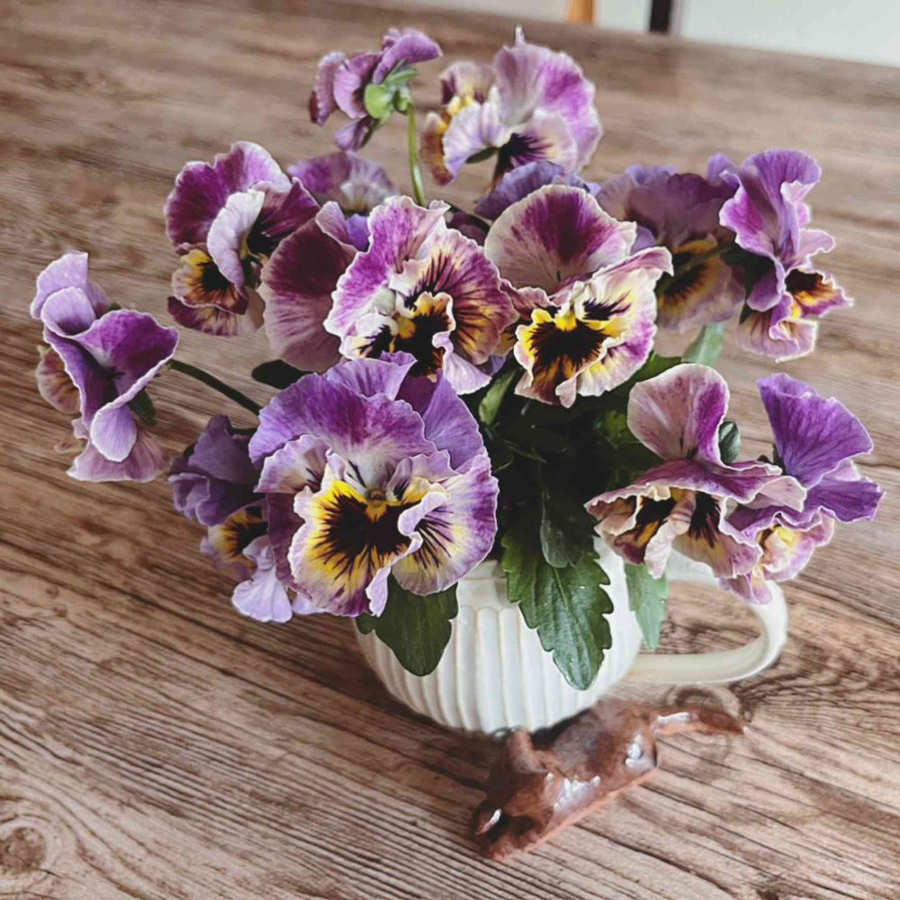 コミコミだった寄せ植えが昨日からの強風でお乱れになっていたので、徒長したミニパンジーを挟んでそのまま生けました