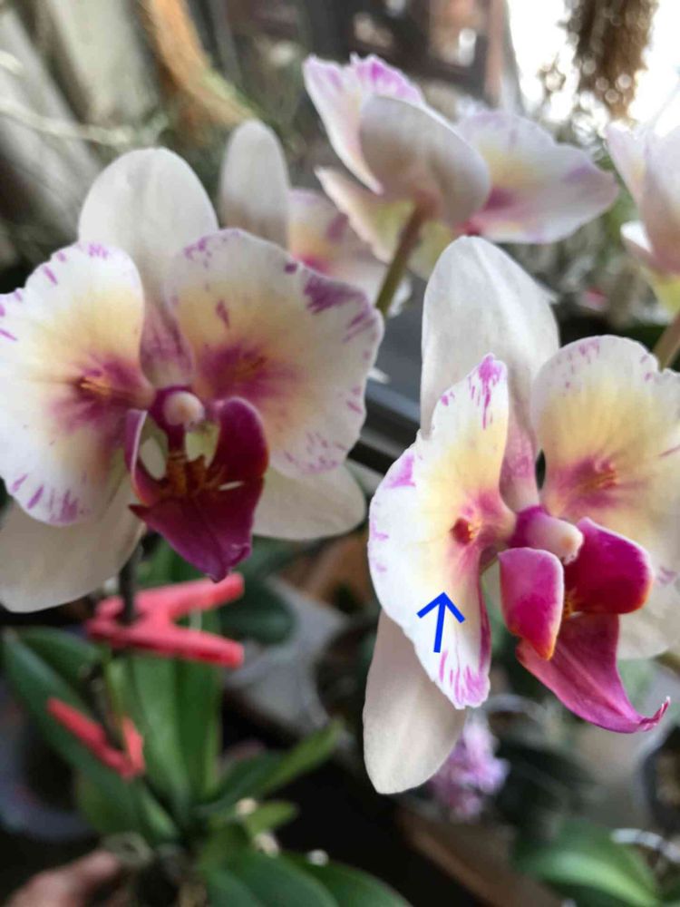 ウチのも見直してみたら蕊柱の下の突起、これだと黄色と赤のまだらの部分と同じ突起が両ペタルにあります。