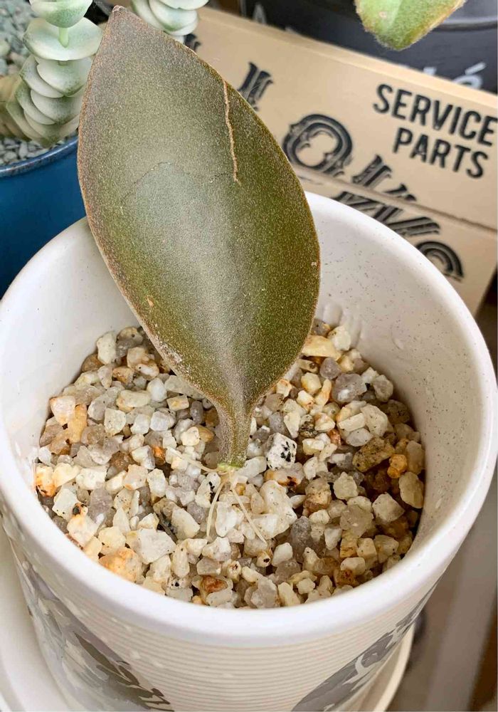 以前折れてしまった天人の舞の葉から根が出たので鉢を用意して置いてみました。