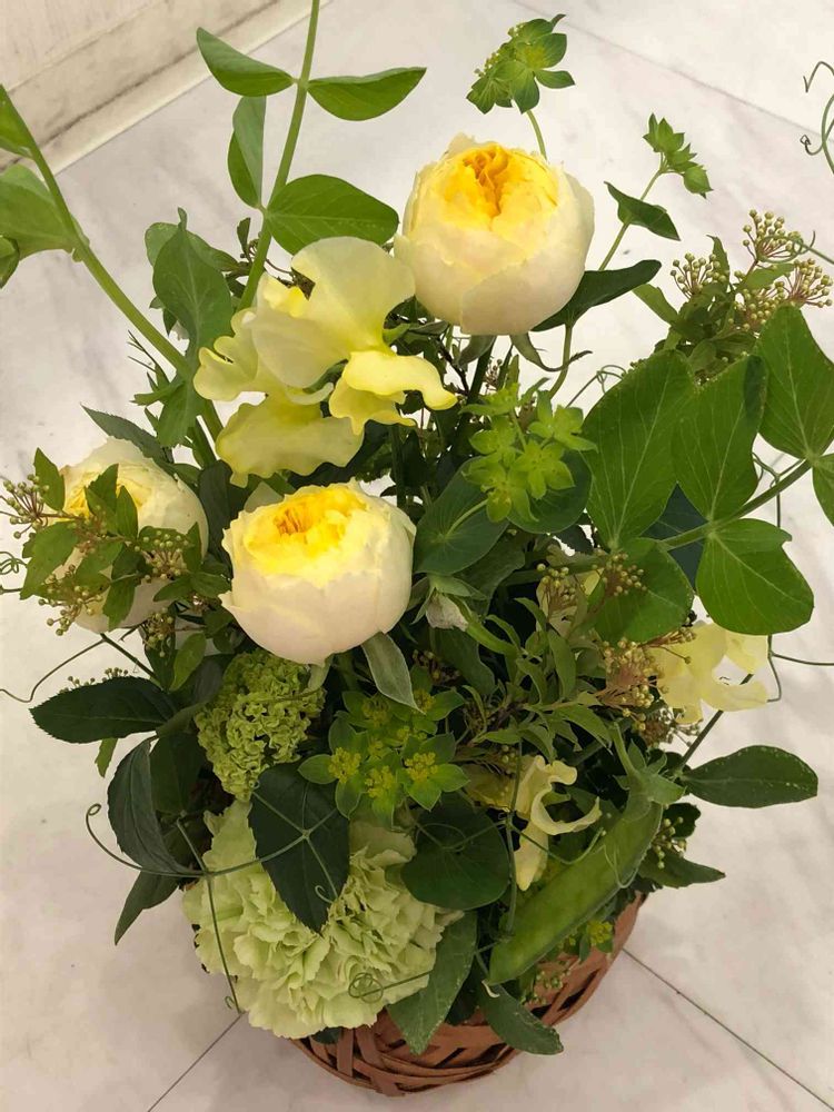 このアレンジにキヌサヤの実が二つ 付いているんです( ^ω^ )
