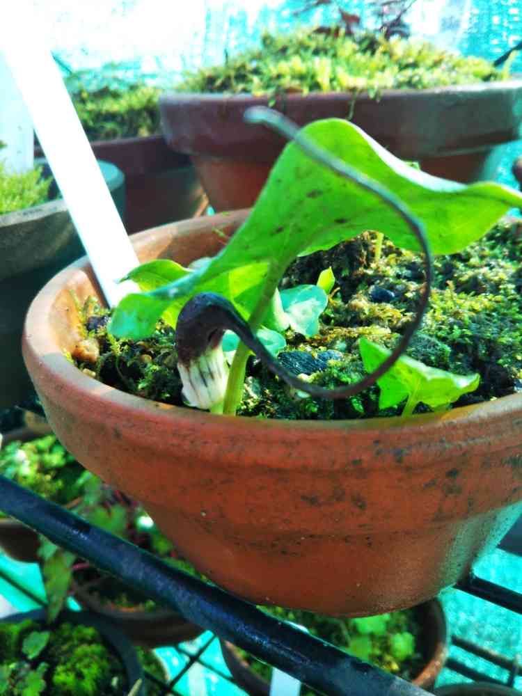 やっとですよ温かくなりました。👴寒暖差に寒気と降参😣してました。今水やり中👀「姫ハンゲ」(テンナンショウ科?) 花🌼❔九鉢中これだけ 象🐘鼻を伸ばしてます。大文字草ナメクジ対策植物😒として一番下に置いてます。昨年は全て葉を食べられましたが、今年は全ての鉢にワンサカ🌱🌱🌱🌱🌱🌱すごいです😃今のところ、象🌼はこの鉢だけです😃