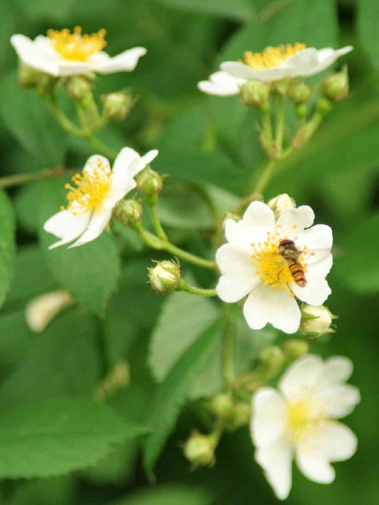 次々と花をつけるノイバラに、ホソヒラタアブが密を吸いに来ました