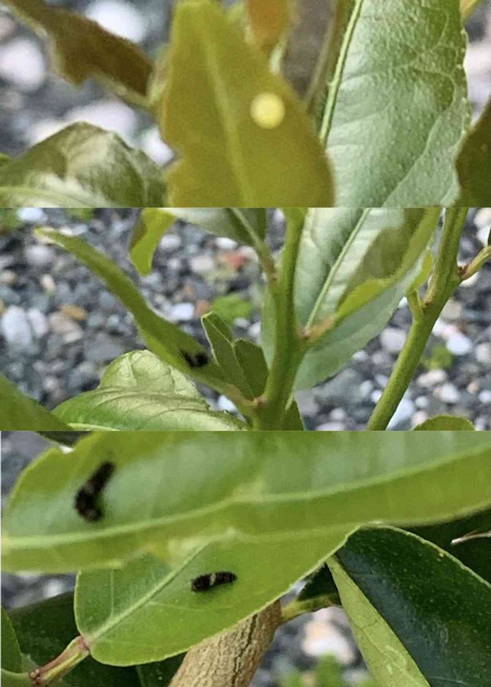 もしやと思ったら植えたばかりのレモン璃の香にも、アゲハの卵2つと生まれたての幼虫5〜6匹が! 割り箸で取りました。
