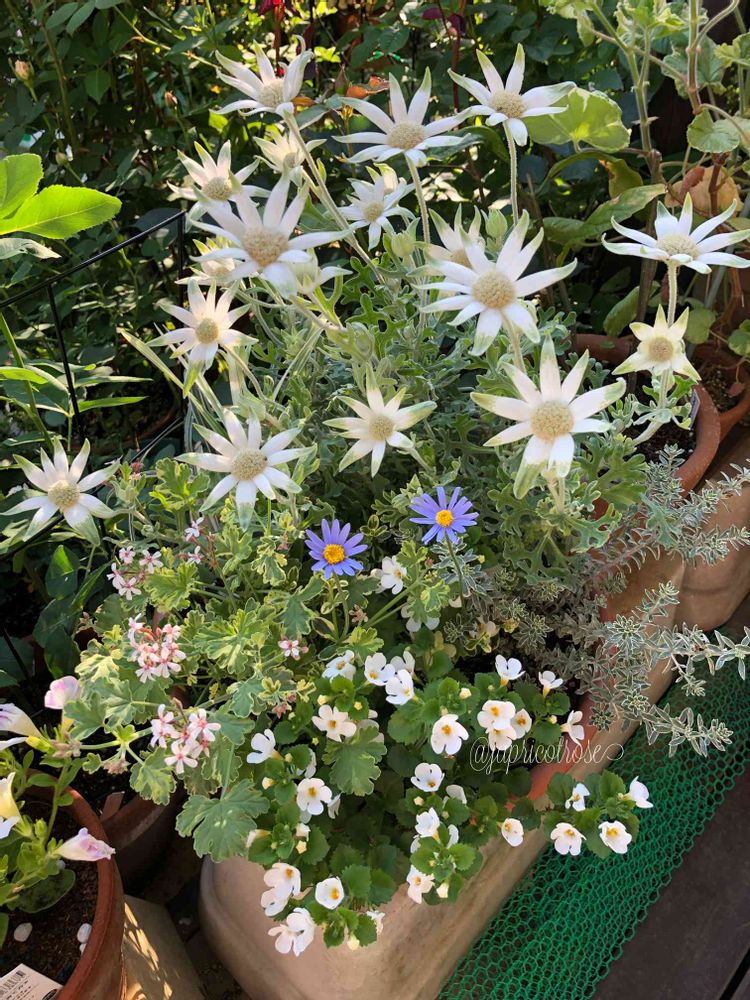 フランネルフラワーは去年寄せ植えにしてあったものをバラして冬の間室内で管理しました。春になったらどんどん花を咲かせてくれています✨