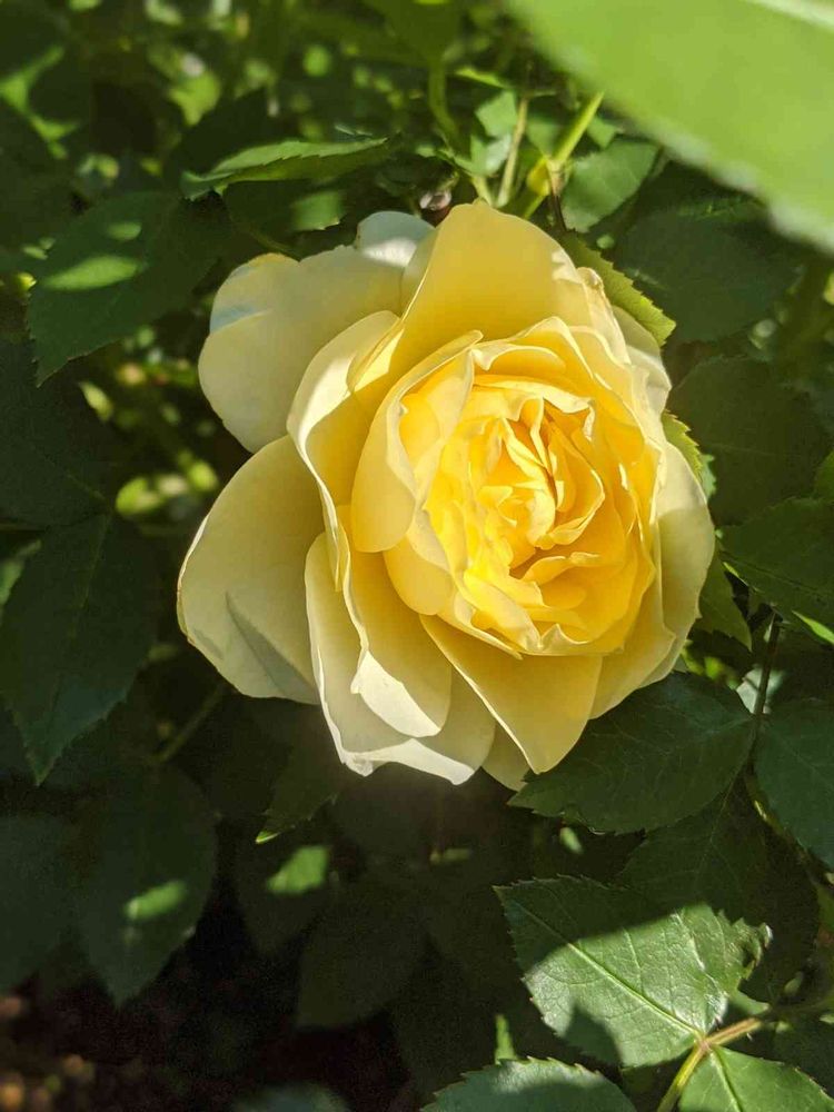 恋きらら…下の方に最初の一輪みっけ❣️です とっても良い香りで優しい黄色で今年は株が大きくなったので花も沢山 見られそうです🌹❣️