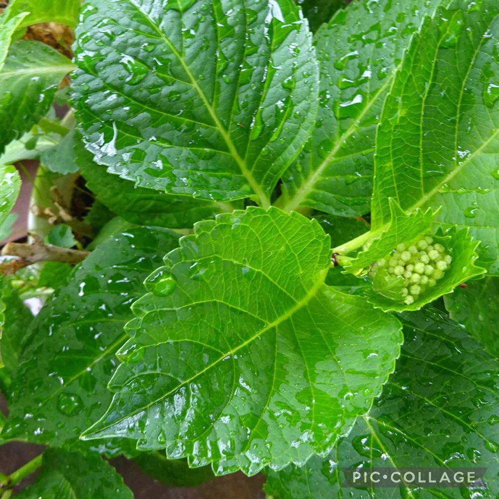 瑞々しい紫陽花の葉、この蕾からどんな色のお花が咲くのでしょうか、楽しみです。