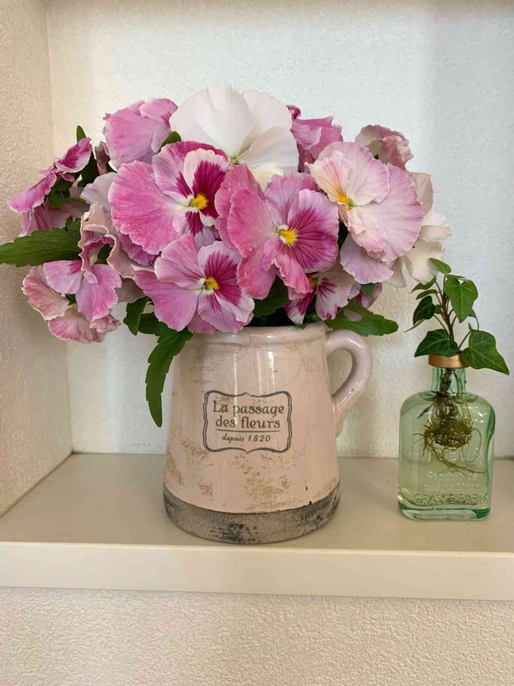 そろそろ終わりのパンジーを、飾ってお部屋で楽しんでいます🌸💓