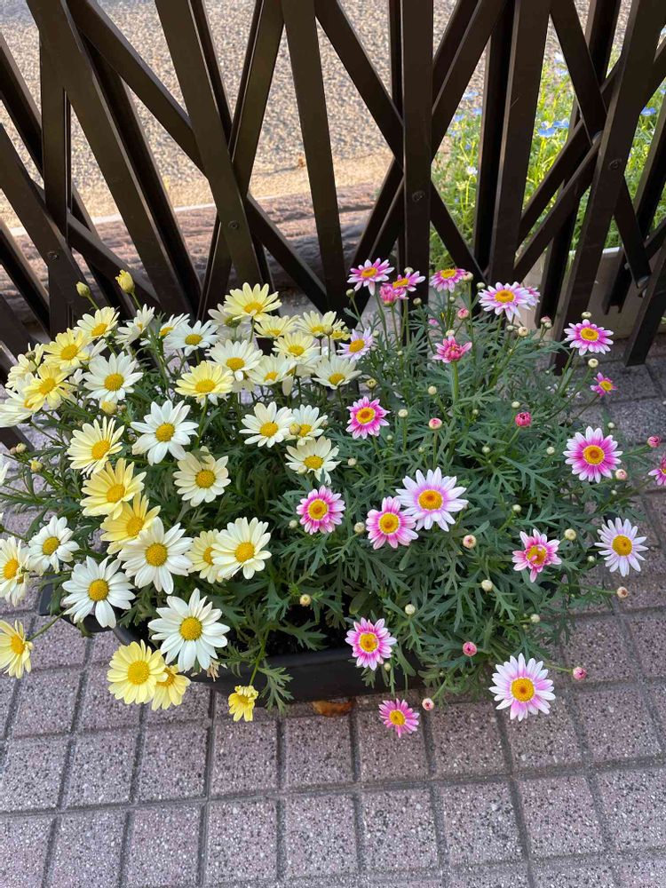おはようございます😃PWのマーガレットやっと黄色と桃が同時に満開です‼️