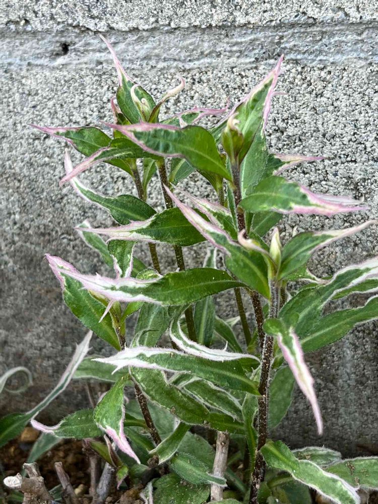 トガリバヨメナ、新芽の頃だけピンクの斑入りとなるようです。
