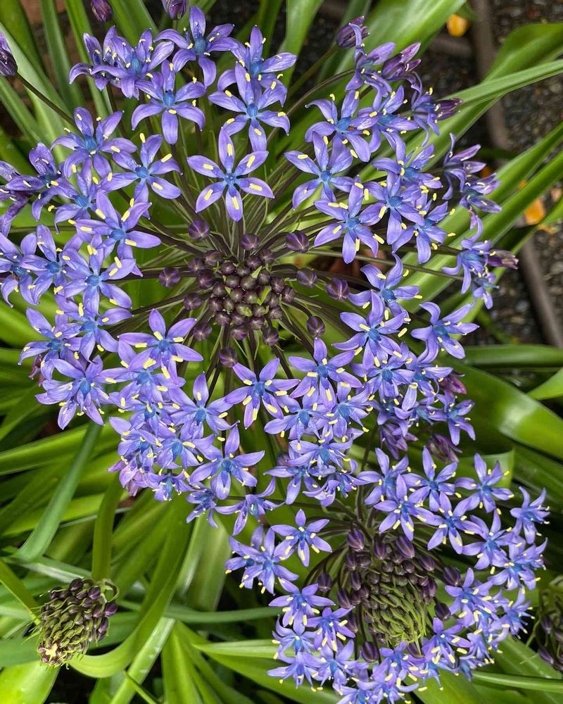 5〜6月ごろ、花茎の先に径2cmぐらいの星型の小花を数十個傘状につける💕