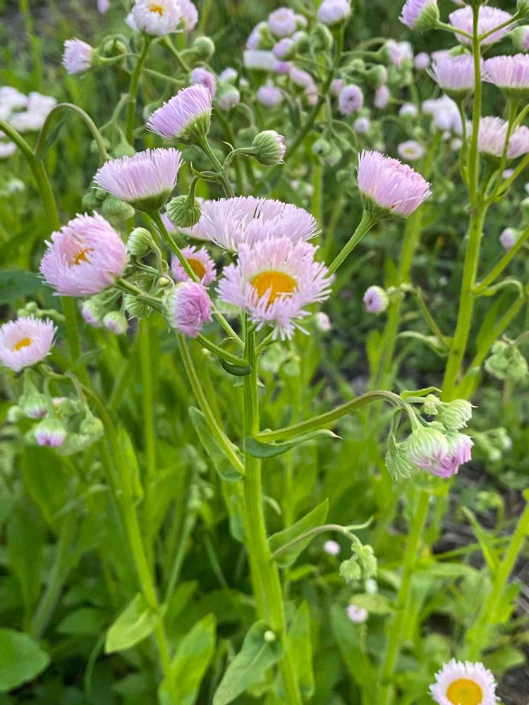 ハルジオンがあちこちに、風になびいて咲いてます😄