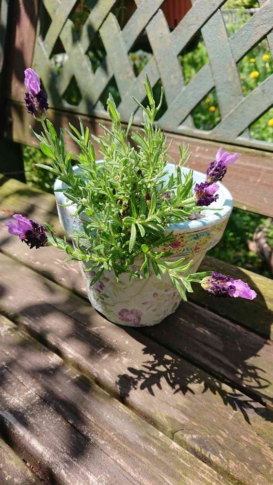 フレンチラベンダーの花と、リメイクした鉢の模様が合っていて、素敵な雰囲気になっていますネ 😃