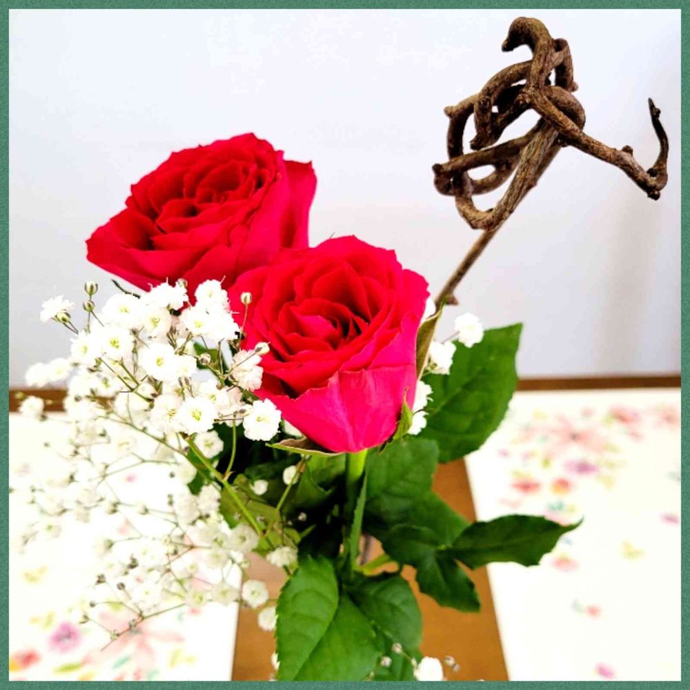 薔薇とかすみ草のテーブルフラワー素敵ですね♡ぐるぐるの枝、面白い形が可愛らしいです🥰
