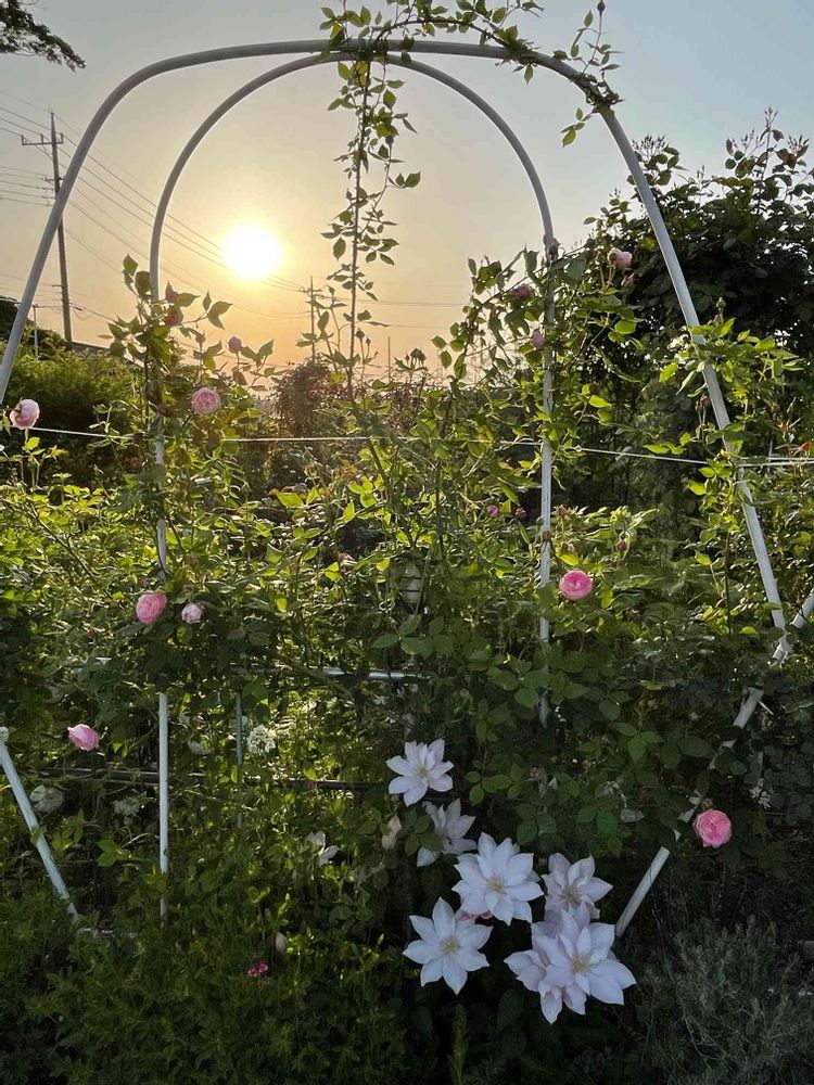 夕陽に白いクレマチスが浮き上がり素敵(*´艸`)🎶