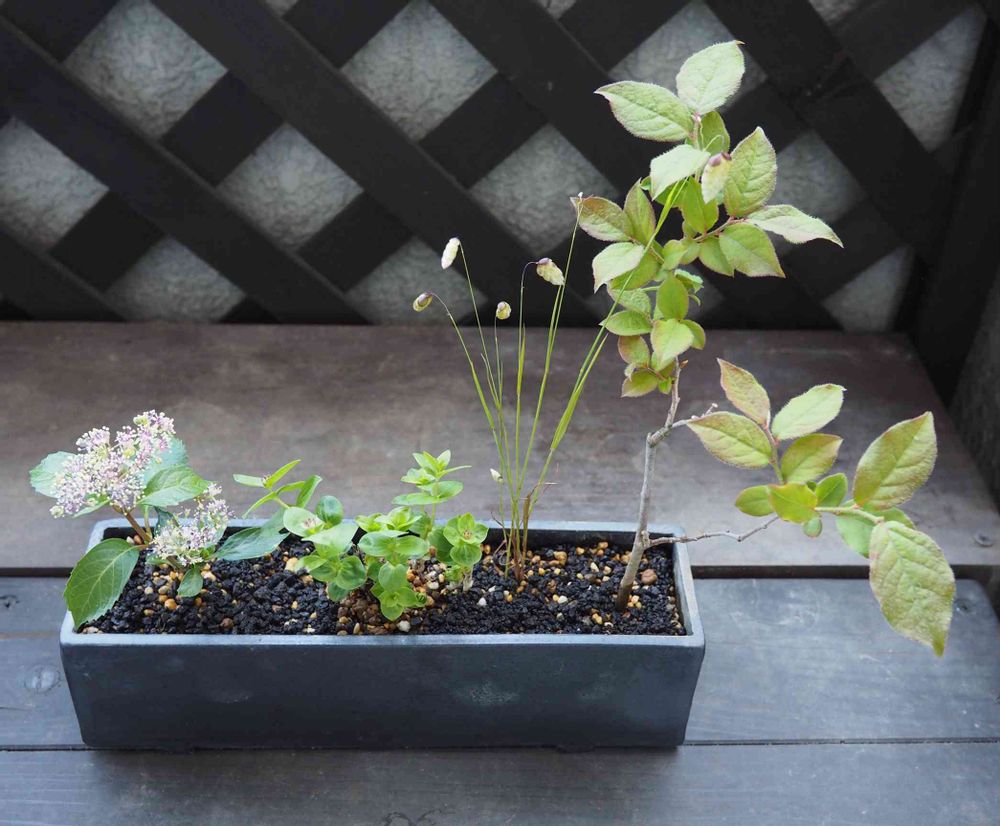 奥多摩コアジサイ(左7センチほど)とエゾゴゼンタチバナと家にあった夏ハゼなどで寄せにしてみました。