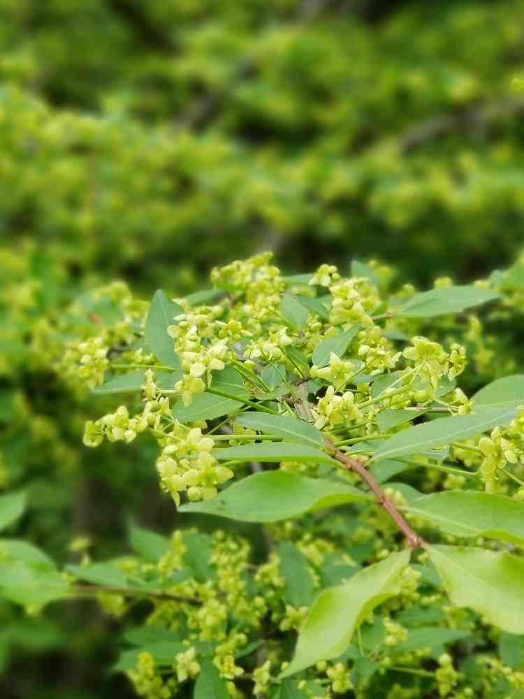 紅葉の鮮やかさと比べると花はつつましい。ニシキギの名前はこの花からではなく 紅葉の赤からきていることが納得できます。最も近い仲間に 翼ができないコマユミがあります。枝に板状の翼がとても興味深いです。