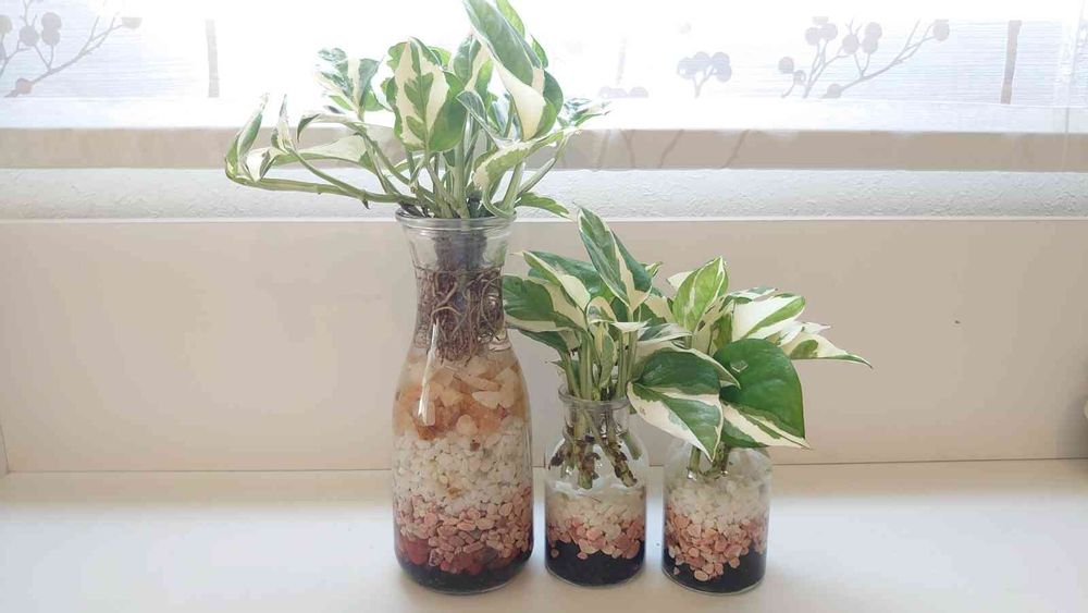 タワー仕立てにしてるポトスはどこにでも売ってる普通のポトス。グリーンって言うのかな?1色でちょっと飽きたので、友人に譲り、【ポトス・エンジョイ】を二株購入。徒長している物をカラーストーンを入れたガラス瓶で水挿し発根させている。このままでも綺麗だから増やして、タワーとハイドロカルチャーでいこう!