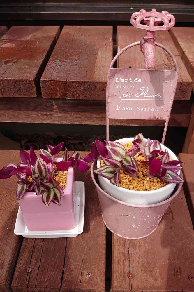 【トラディスカンティア・セブリナ・ペンデュラ】トラディスカンチア属。葉表はラメのような白銀の2本のラインが印象的。日照条件によって葉の縁と中央の色味が深い緑から赤紫に変わります。葉裏は、深い赤紫。このコントラストが美しい😍葉の表面は産毛があってラメのような光沢感♪朝日を浴びて光る葉が凄く綺麗だ🎵伸びた枝を深めのガラスコップで水挿しすると、葉裏の紫も見えて美しい❤増えたらバンキングで楽しみたい🎵