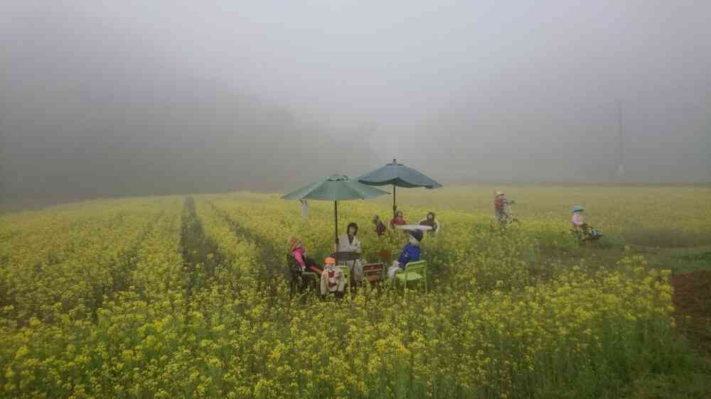 今朝は 少し先も真っ白で見えないくらいの中 菜の花の中に