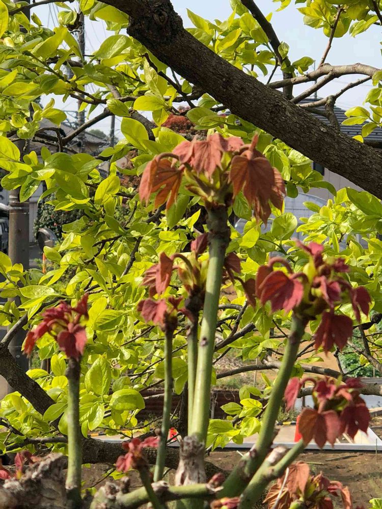 青桐の新芽が紅葉葉ゼラニウム🍁の様に赤くてカワイイ。これから柿の葉と共にどんどん大きく拡げて、庭の半分を半日陰にする。鳩も巣を作る事もあります。