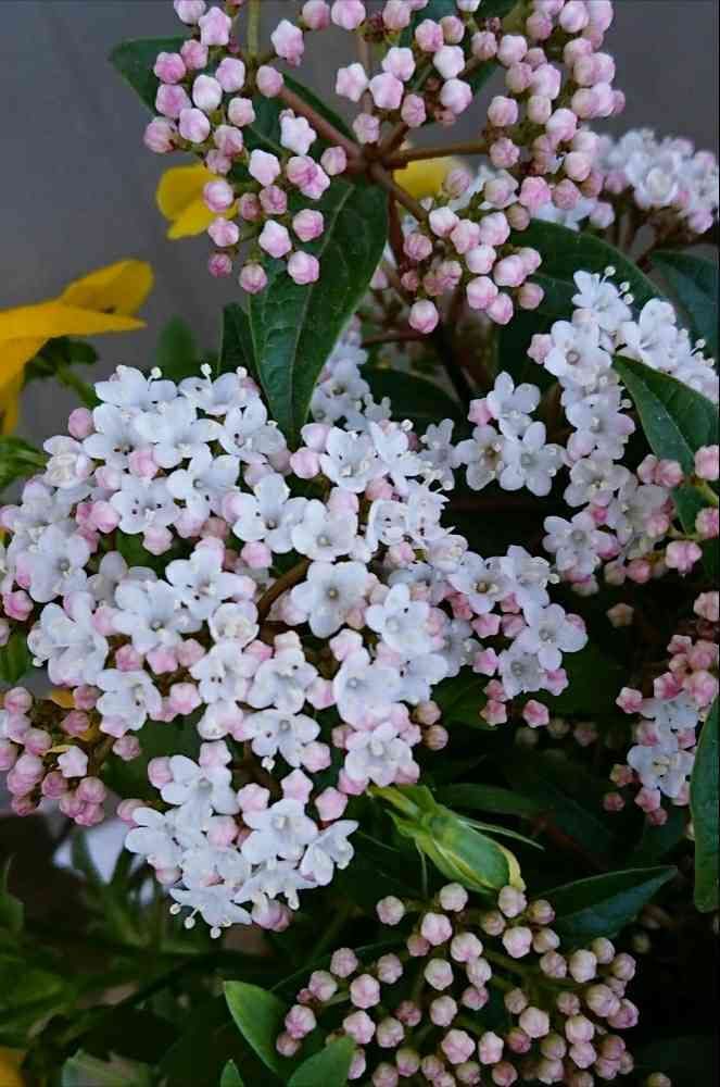 寄せ植えのビバーナム・ティヌスやっと咲きだしました🎶 膨らんだもうすぐ開く蕾のピンクが可愛くて💓