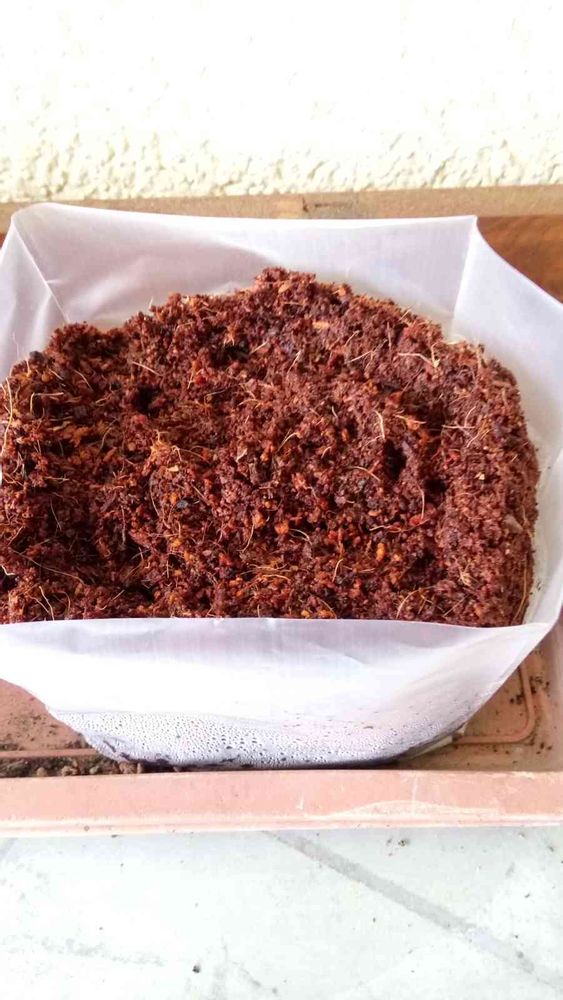土というか乾燥した硬いもの(粉砕やしの木?)の中に水を入れてふやかし、その中にミニひまわりの種を6粒撒いて見た。