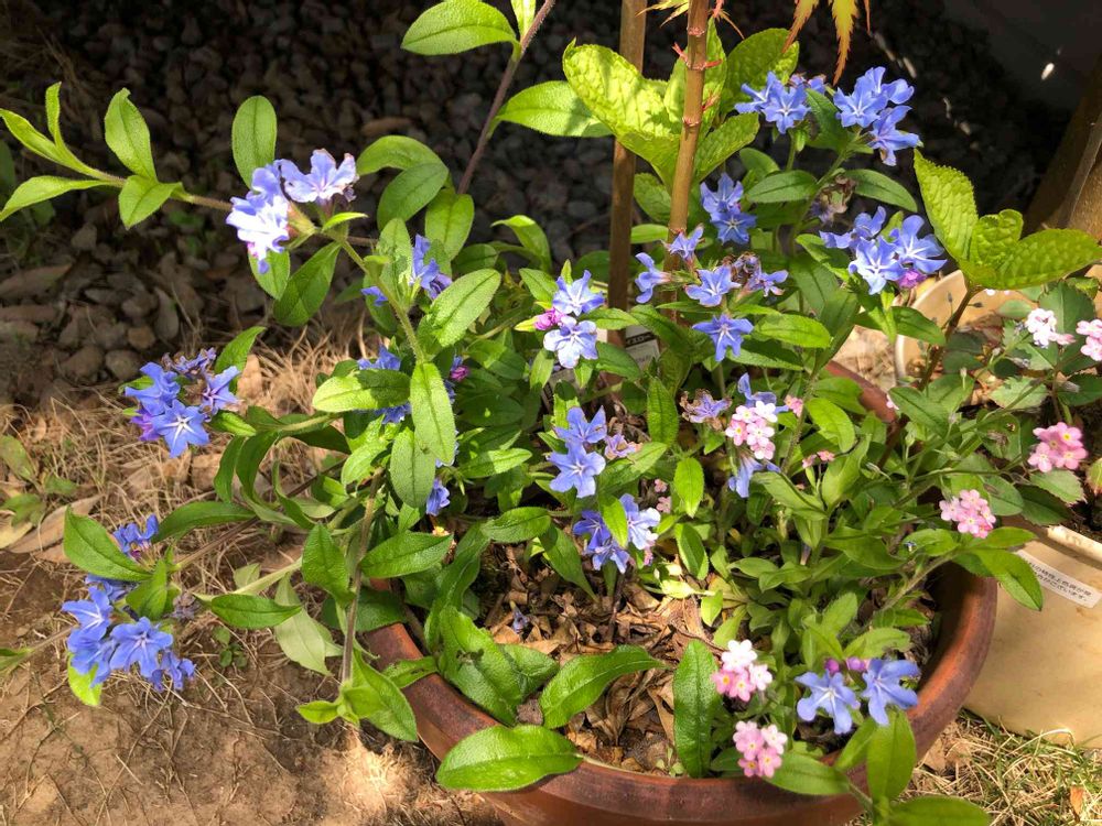 昨年の春に少し頂いたブルーの花、一緒に咲いているピンクの勿忘草に似たような咲き方で花がかなり大きいです!