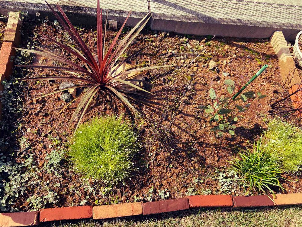 夏の暑さにも強いコルジリネを植えてみましたが、早くも葉焼け気味です。。。