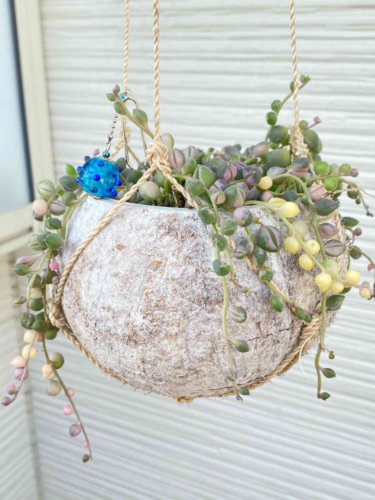 ヤシの実の鉢?にグリネ斑入り植え付けて