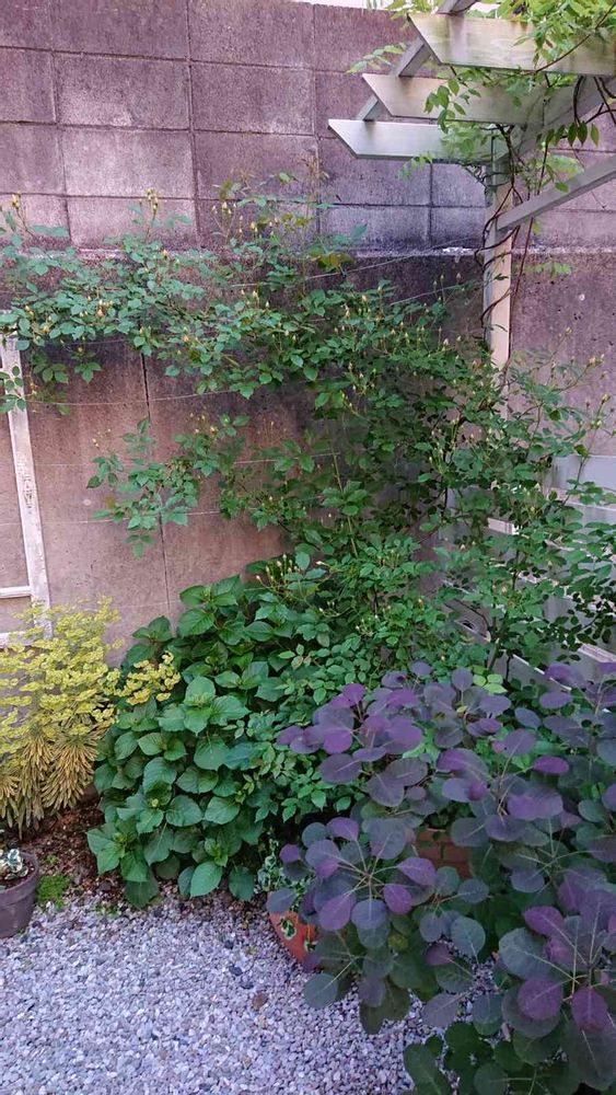 手前のスモークツリー、良い色❤️けど花芽、ない…😑日陰にいるからかな