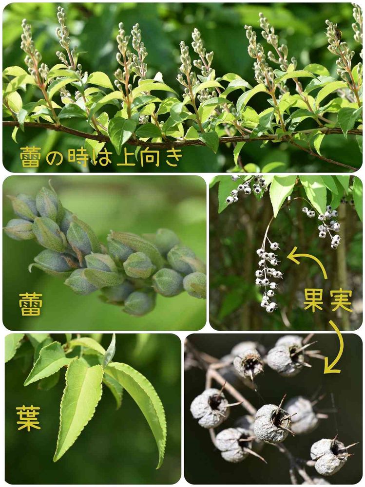 林縁部などに生える。雌雄同株。葉は卵状長楕円形〜卵状披針形で、対生。枝先に円錐花序をつけ、白い花を多くまとまってつけ、垂れ下がる。普通、花弁は5枚。果実は椀形のような球形。果実の先端には花柱が残る。