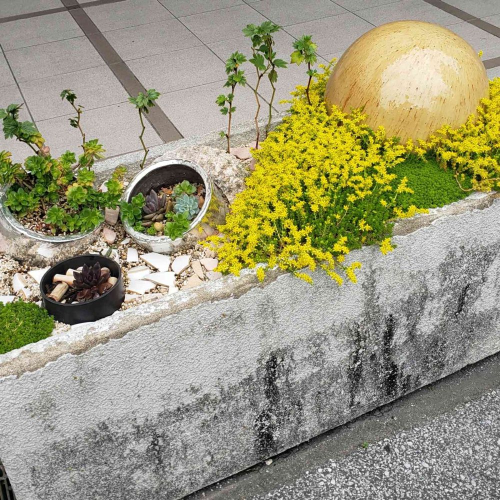 街中に多肉の寄せ植えが有るの♪右上↗️のツヤツヤ輝く、アボカドの種風なのは何⁉️