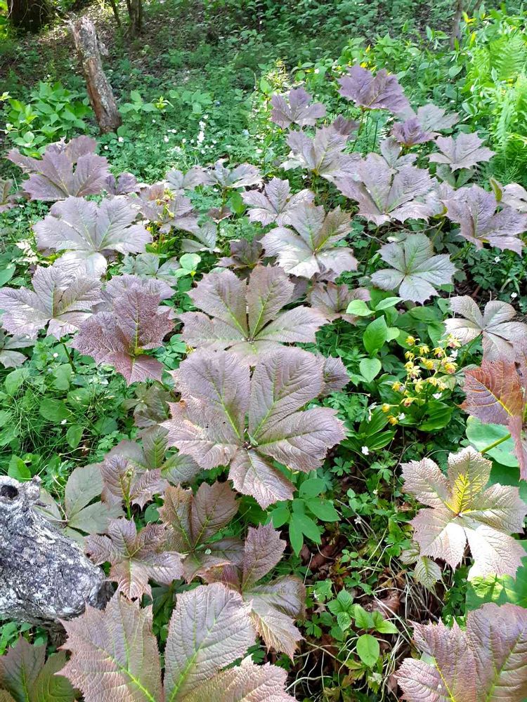 緑の草の中に薄紫色の葉っぱが、陽を浴びて